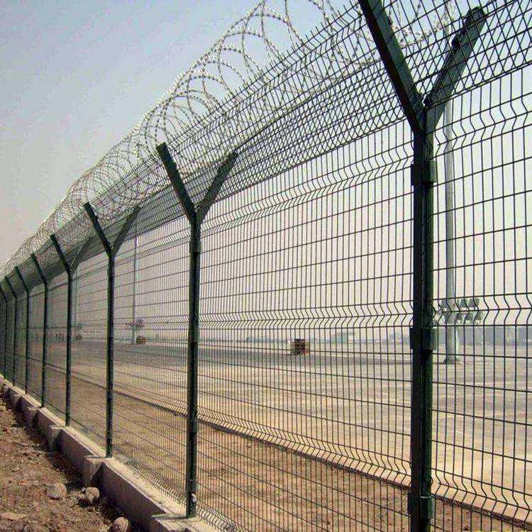 機場護欄網和普通護欄網最大的區別在立柱上面,機場護欄網的立柱上部一般帶有V型刀片刺繩支架。可以更好的支撐刀片刺繩。而且機場護欄網一般高度在2米以上,護欄網的高度要高于普通護欄網。普通護欄網一般高度在1.8米左右。機場護欄網和普通護欄網的絲徑也有區別。機場護欄網的絲徑一般絲徑在5.0mm左右而普通護欄網的絲徑一般在4.0mm左右。機場護欄網上部有刀片刺繩可以更好的防止人員對機場的破壞和攀爬。防護方面要高于普通護欄網。以上就是機場護欄網和普通護欄網的區別。