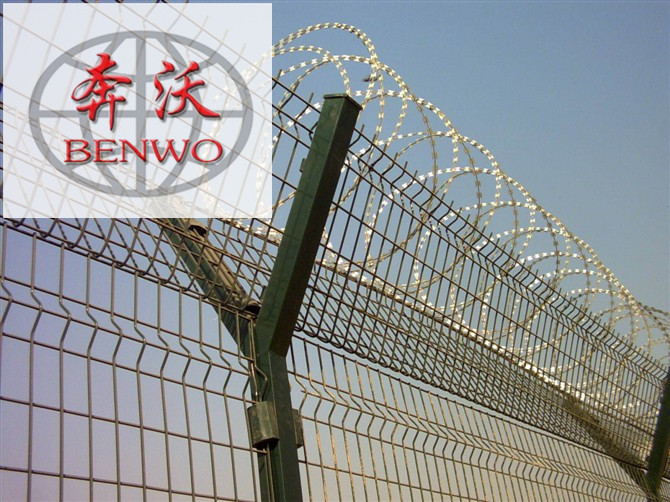 機場護欄網有什么構造? 機場護欄網又稱作“Y型安全防御護網”,是由V型支架立柱,加強型焊接片網,安全防盜連接件和熱鍍鋅刀片刺籠組成加強度和安全防御性級別很高。